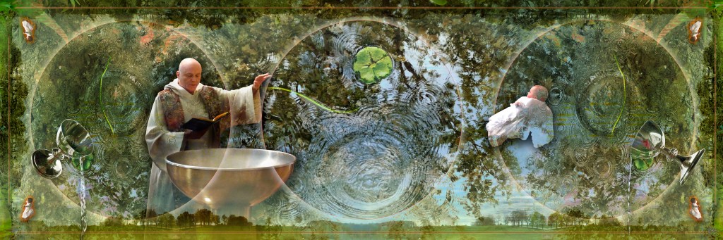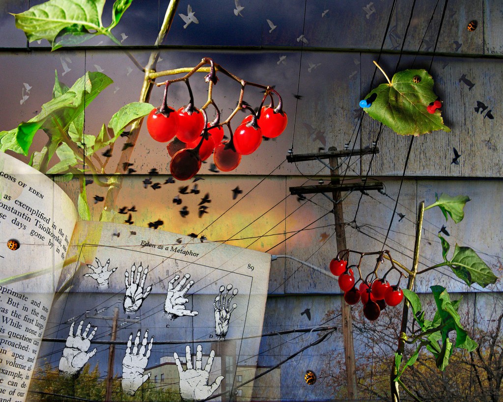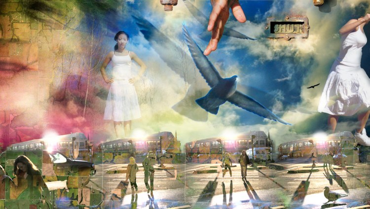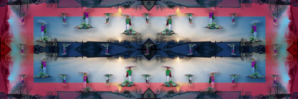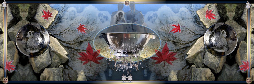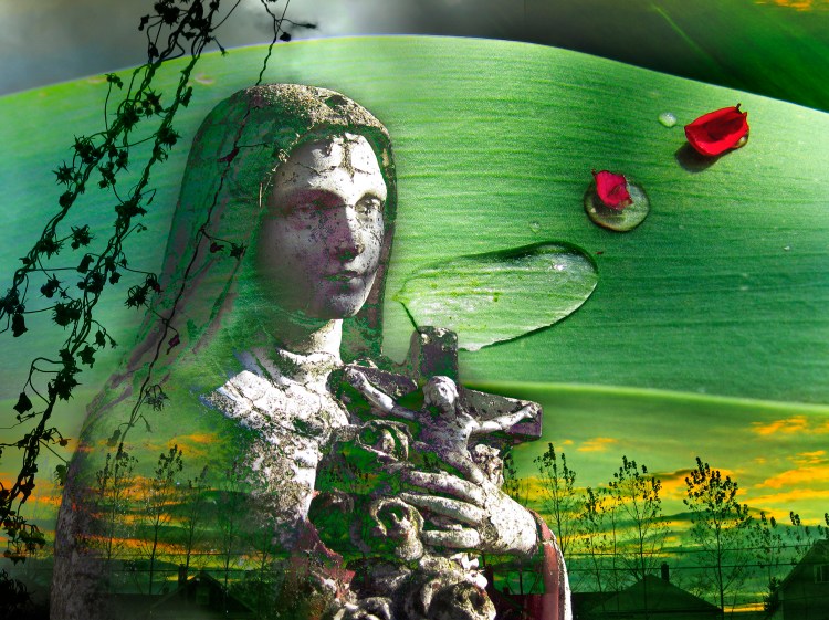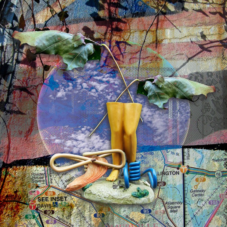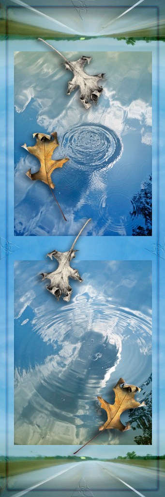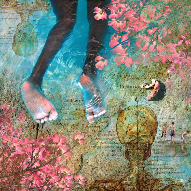 While working at Tufts University, I drove past the Mystic River every day on the way home, often stopping to take pictures and/or shake off the stress of the day. When I got caught in a brief afternoon shower one day, I began to wonder about the water molecules landing on my head. Had they, at some point in the past, evaporated into the clouds from the river or the Mystic Lake and did the river ‘recognize them’ as familiar or ‘known’? Was the water in the river sentient, did it acknowledge or sense familiarity in the return of it’s own water molecules? Was the river capable of dreaming? These thoughts inspired the Mystic River Dreaming series. Most of the my collages were created on the fly with little pre-planning, but each of the river series collages were planned in advance and have a specific order.