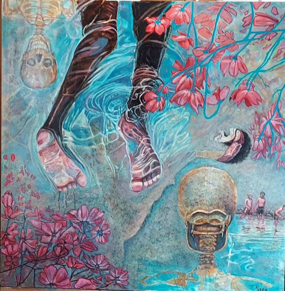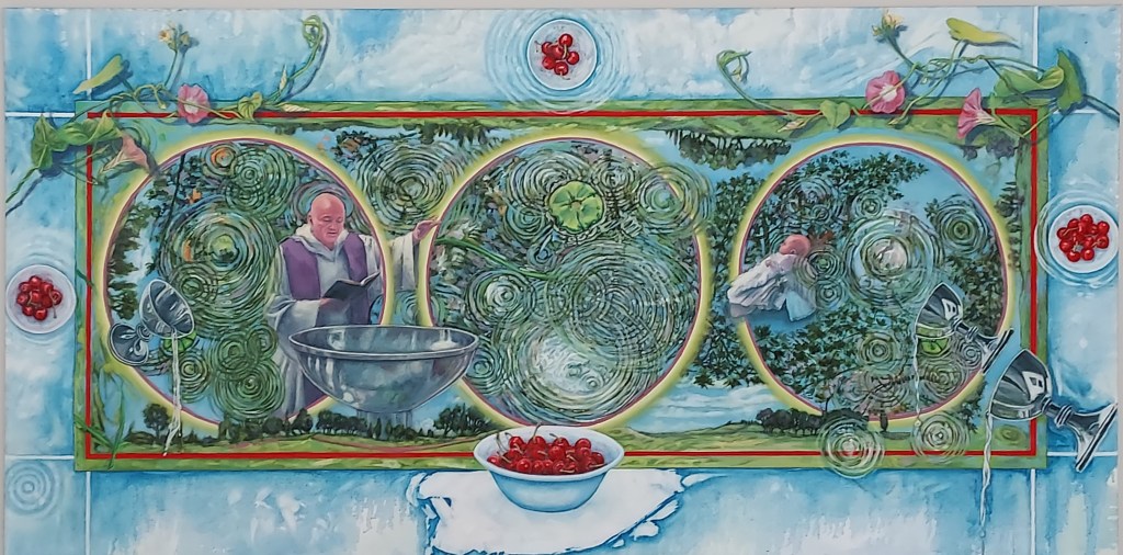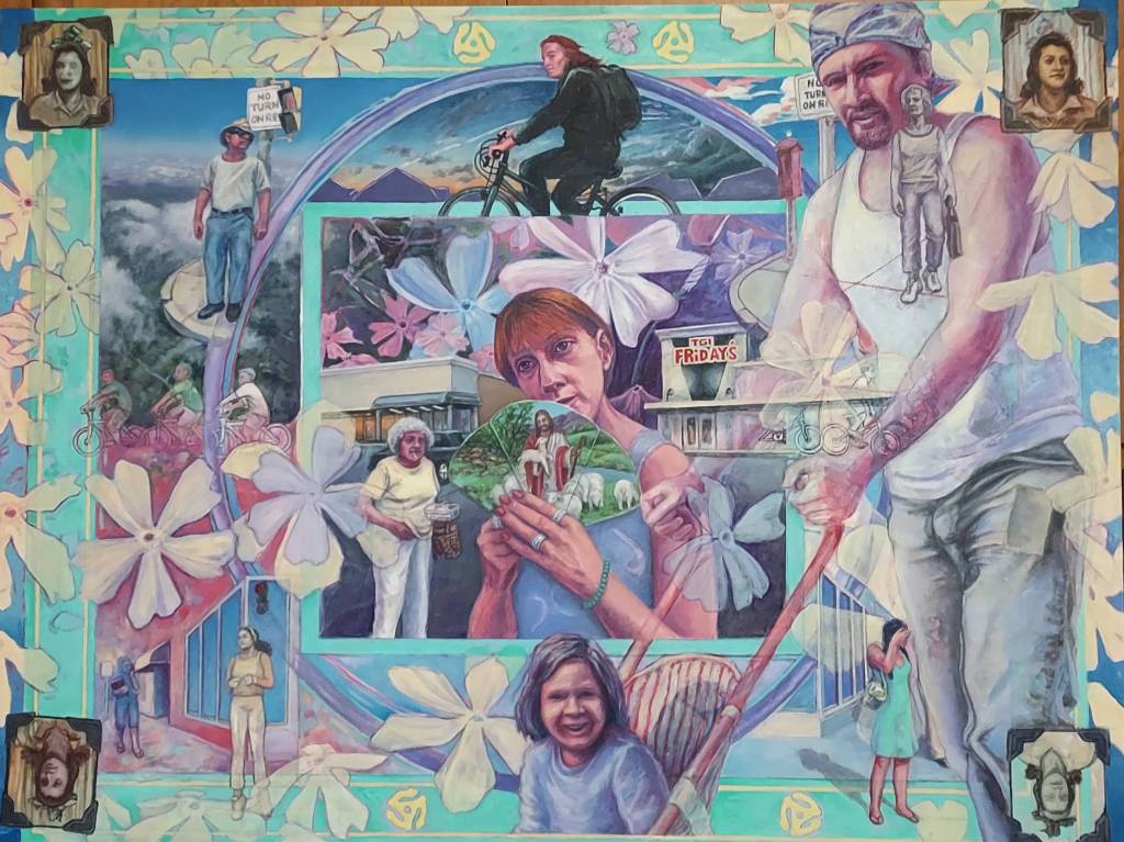It has taken me 10 years to find my painting sea legs again and I feel that most of the work below are more “studies” than “art”; time logged developing techniques and making friends with the medium and tools again. I find my paintings and approach to creating art are heavily influenced by my experience working in Photography, Digital Collage and Watercolor. My design choices and aesthetic are influenced by my time spent as an offset printing press operator (many images printed on the same sheet of test paper), the photo collages my sister Kathy startedu creating as a teen, and years working as a leaded glass fabricator, glazier, installer and designer (my love of and fascination with borders).